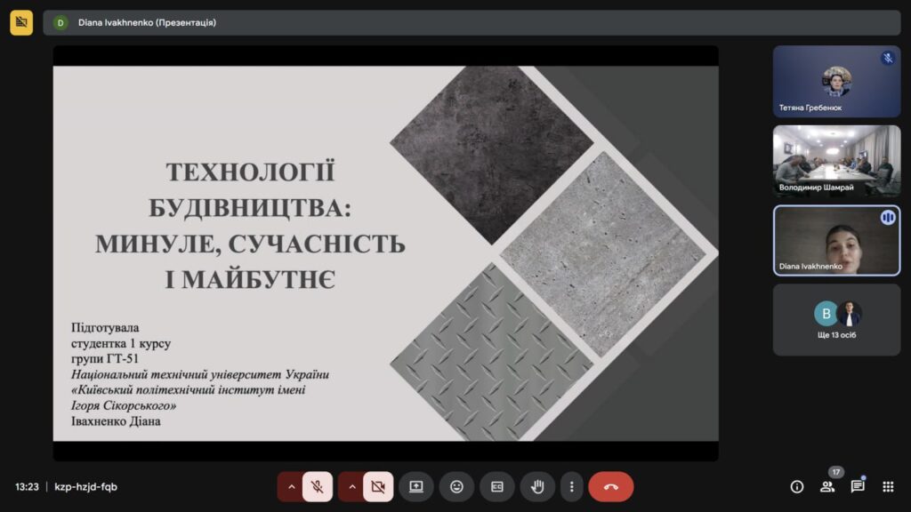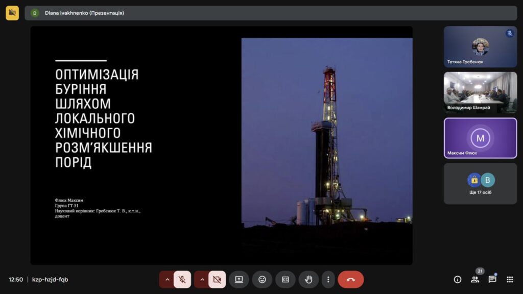 Студенти першого курсу бакалаврського та магістерського рівнів спеціальності G2 «Технології захисту навколишнього середовища» групи ГТ‑51 — Івахненко Діана та Флюх Максим — у рамках наукового гуртка «Екомайнінг» під керівництвом к.т.н., доцента Гребенюк Тетяни Володимирівни взяли активну участь у ІІІ Всеукраїнській науково‑практичній конференції «Сучасні проблеми гірництва та будівництва». Вони представили власні науково‑дослідні роботи у вигляді змістовних презентацій, продемонструвавши інноваційне бачення вирішення актуальних екологічних викликів у гірничій та будівельній галузях.