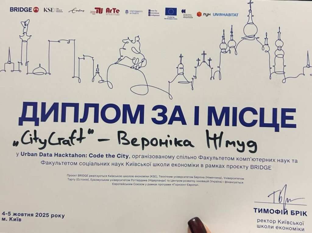 Сьогодні наша студентка групи ГТ-41 спеціальності G2 “Технології захисту навколишнього середовища” Вероніка Жмуд взяла участь у командній грі в межах Urban Data Hackathon: Code the City, та здобула 🏆🥇перше місце разом із командою.